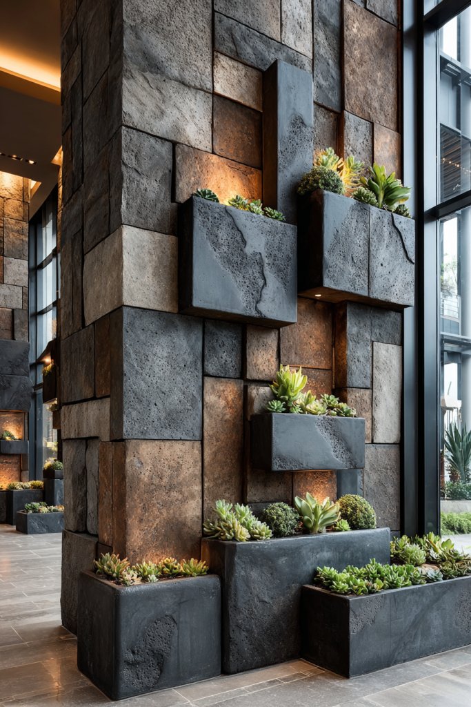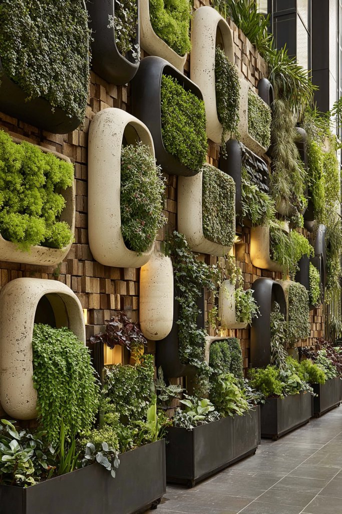 Visualize a sleek, textured panel made from materials like metal, wood, or composite, embedded with built-in planters. These panels host a variety of plants—succulents, ferns, or trailing species—arranged in a geometric or abstract pattern. The contrast of materials and colors enhances the visual impact, transforming a blank wall into a living piece of art. At night, subtle lighting highlights the textures and plant silhouettes, creating a captivating scene.