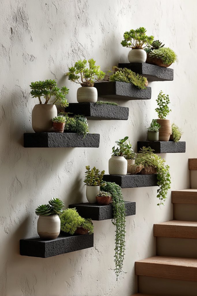 Imagine a set of slim, sturdy shelves mounted on your wall, each holding small pots or containers filled with greenery. The plants cascade down from the shelves, creating a visual flow of textures and colors. The floating design makes the space feel open and airy, and the layered arrangement adds depth and interest. It’s like building a vertical garden that’s both functional and beautiful.