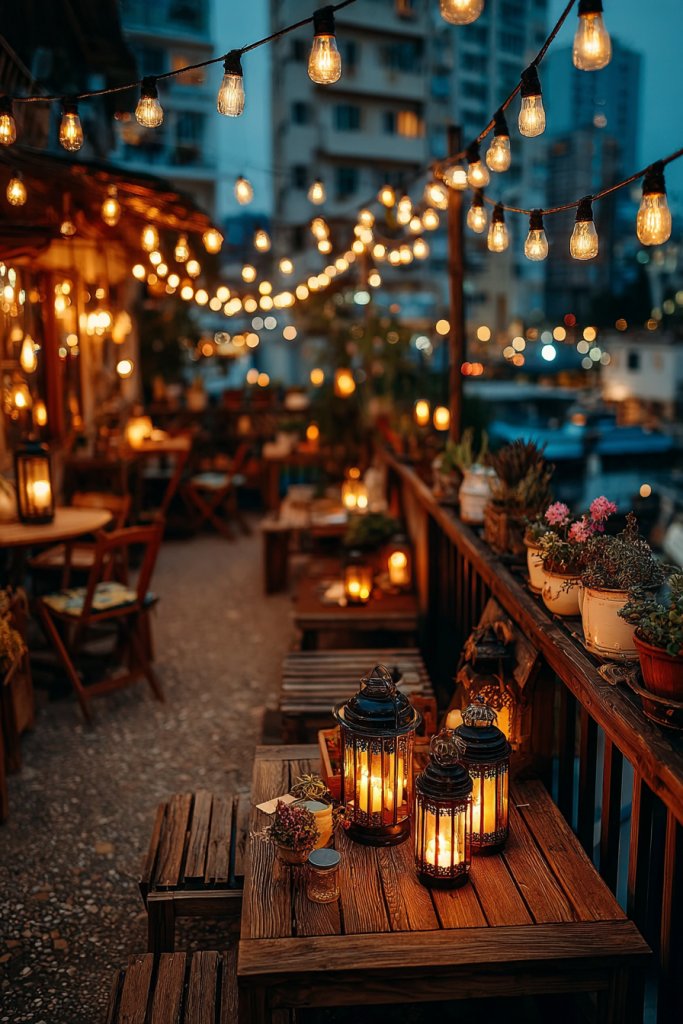 Picture delicate string lights draped across your patio or balcony, casting a soft glow over plants, furniture, and decorative accents. Tiny lanterns or fairy lights twinkle among your greenery, creating a starry, magical atmosphere. The ambient lighting invites you to linger outside, relax with a book, or enjoy intimate gatherings. The gentle radiance turns your small outdoor space into a nighttime haven.