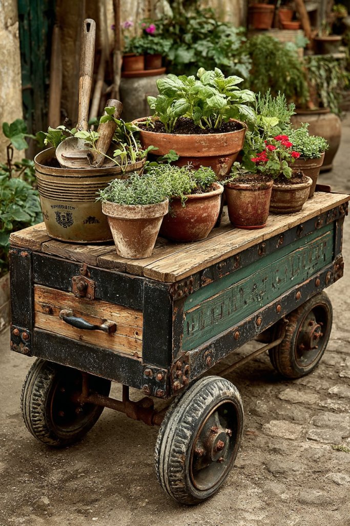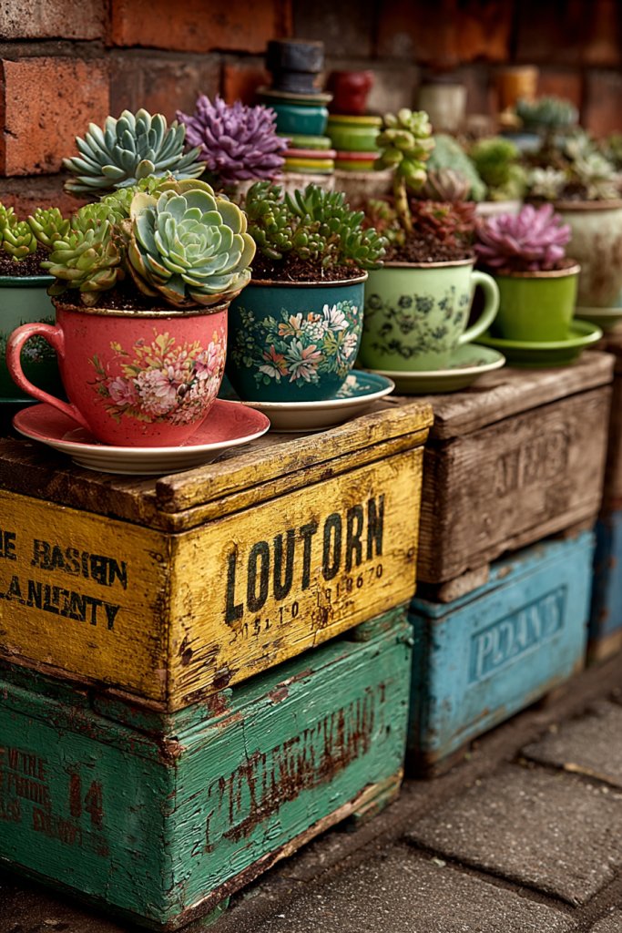 Imagine a row of vintage tin cans, painted in bright colors or distressed for a shabby chic look, each holding a different plant. Old boots, teacups, or wooden crates are repurposed into charming planters that tell a story of creativity and eco-consciousness. The textures and colors create a playful, eclectic vibe that makes your garden uniquely yours. The plants seem to spill out of these unconventional containers, adding character and whimsy.