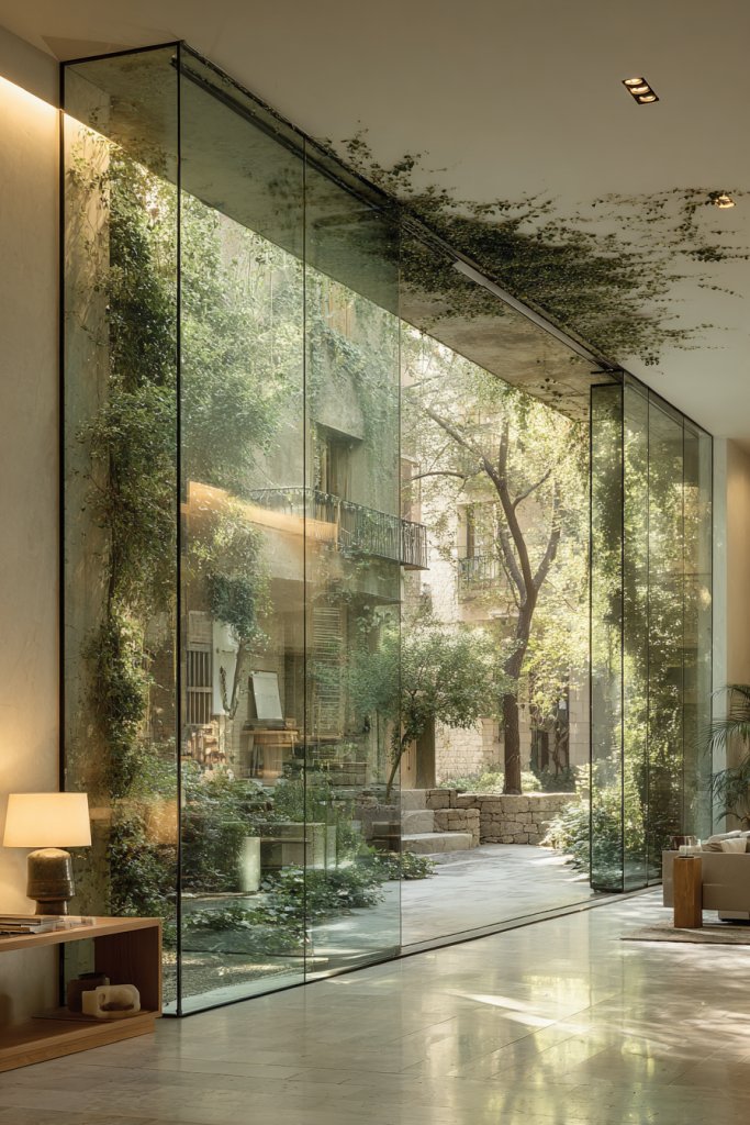 Imagine a set of sleek, large folding glass doors that slide open to reveal a lush, green outdoor terrace. When closed, they keep your indoor environment cozy and protected. When opened, the boundary between inside and outside disappears, flooding your living space with natural light and fresh air. You can enjoy your plants from both inside and out, creating a unified, inviting environment. It’s like living in a garden-themed dream.
