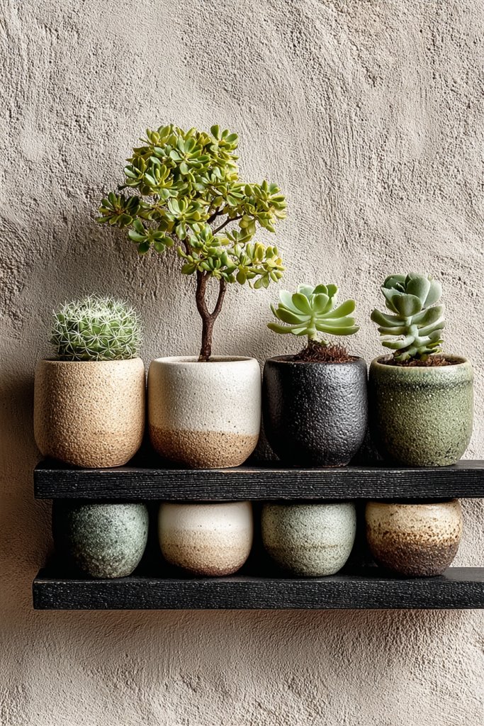 Arrange the pots in artistic groupings or on decorative trays. Mix in decorative stones, shells, or small sculptures for added personality. Label your plants with sleek tags or paint the pots for a cohesive look. Change up the arrangement seasonally to keep it fresh. Incorporate a small, portable watering can for quick care sessions.