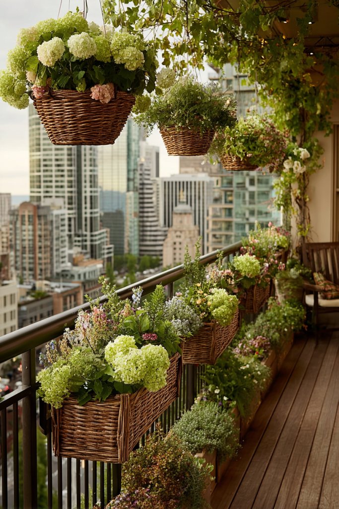 Visualize a series of woven or metal baskets suspended from your balcony’s edge, overflowing with trailing vines, blooms, or fragrant herbs. The baskets sway gently in the breeze, adding movement and charm. The greenery spills over the sides, creating a soft curtain of natural color that frames your outdoor space. The effect is both inviting and whimsical, like having your own hanging garden.