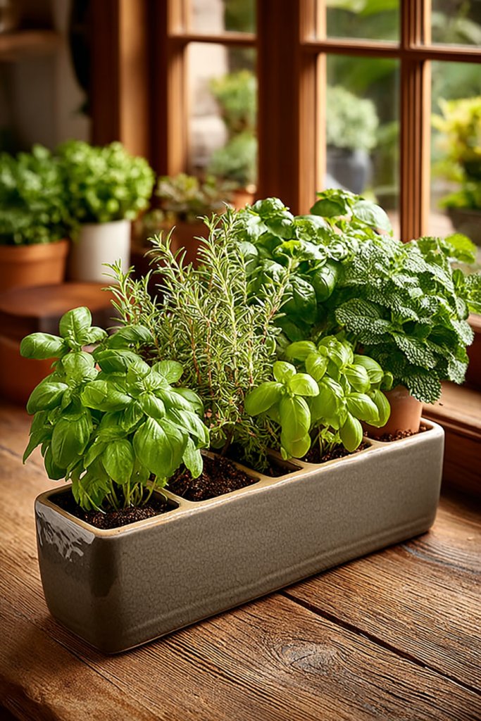 Imagine a narrow, deep window box attached beneath your kitchen window sill, brimming with vibrant basil, rosemary, and thyme. The herbs sway gently in the breeze, releasing delightful scents each time you open the window. The container’s rustic ceramic or sleek plastic surface complements your kitchen decor, creating a lively, edible corner that feels both fresh and functional. It’s like having a mini farm right above your sink.