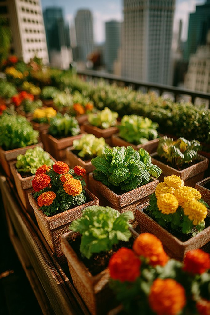 Envision a colorful mosaic of small pots arranged along the edge of your terrace, overflowing with cheerful flowers, leafy greens, and even small shrubs. The containers vary in height and style, adding visual interest and depth. The scent of blooming flowers mingles with the fresh air, while textured textiles or outdoor rugs define seating zones. It’s a cozy, personalized corner that invites relaxation and outdoor dining.