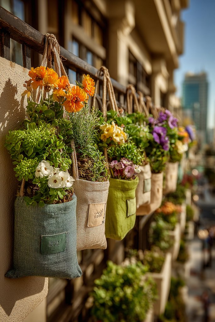 Visualize rows of fabric pockets attached to your railing or wall, bursting with vibrant greenery and colorful flowers. The pockets hang like soft, textured patches that catch the sunlight, creating a layered, mosaic-like effect. The fabric’s flexibility allows you to customize the layout, filling in gaps or expanding your garden as needed. It’s a cozy, inviting space that feels like a secret garden in the sky.