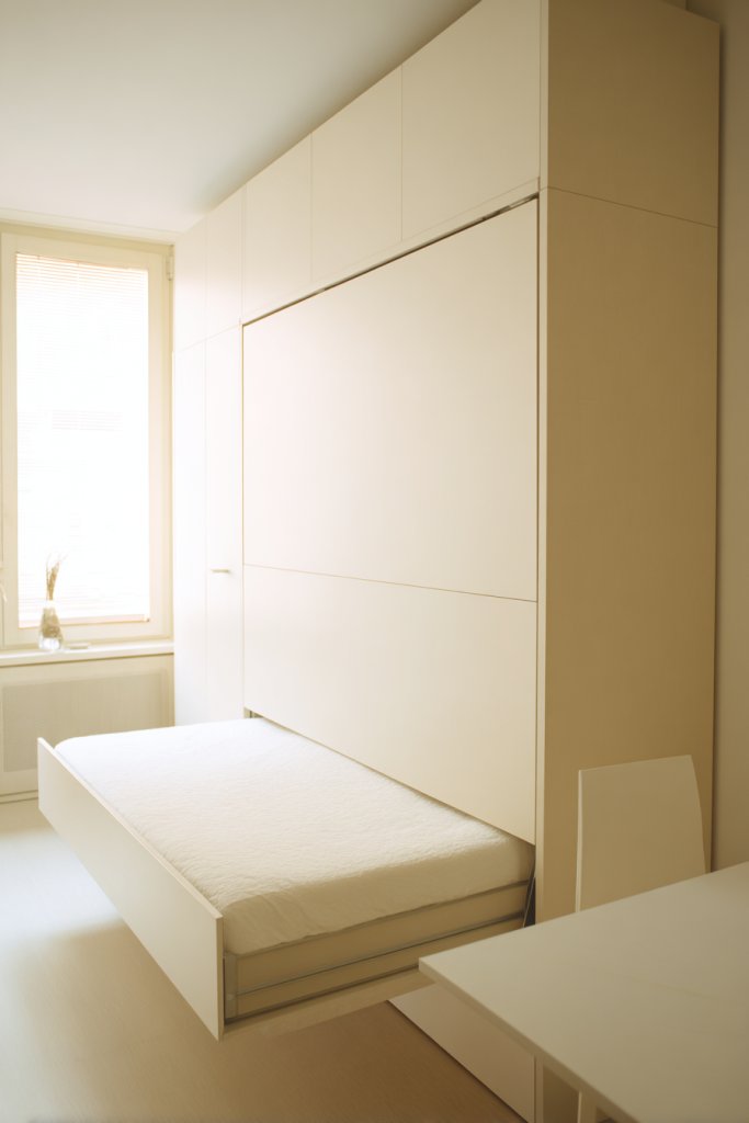 Imagine a sleek wall-mounted bed that folds up seamlessly during the day, revealing a clean, open floor. Beneath it, built-in drawers or shelves hide essentials like extra bedding or seasonal clothing. The room feels uncluttered, with a soft fabric headboard adding a touch of warmth. When folded up, the space looks airy, bright, and ready for lounging or working.
