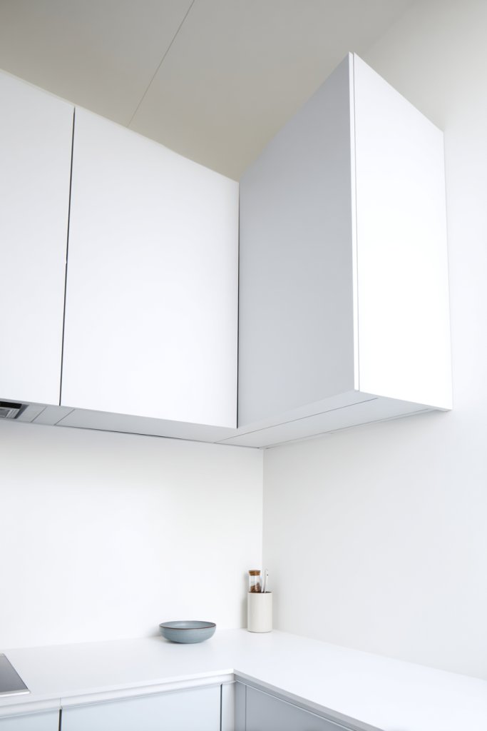 Picture sleek, high-mounted cabinets that reach the ceiling, painted in a light color to reflect light and make the room feel taller. The cabinets hide away dishes, dry goods, or cleaning supplies, keeping counters clear. Below, a minimalist countertop with a few well-chosen accessories keeps the space looking fresh. The overall look is streamlined, organized, and airy.