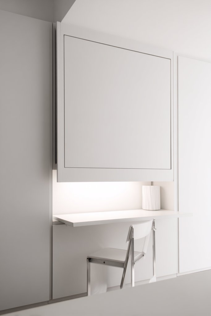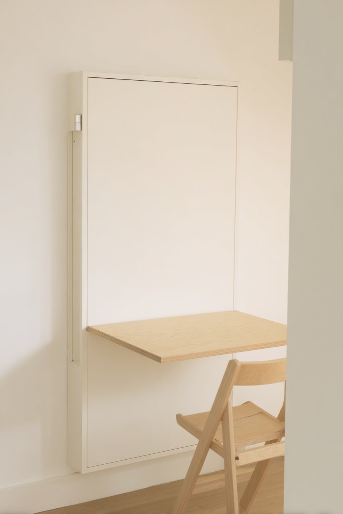 Working or studying from a tiny studio often feels like trying to fit a square peg into a round hole. Cluttered surfaces and lack of dedicated workspace hinder productivity. A fold-out desk hidden behind a wall panel offers a sleek, space-saving solution that keeps your space tidy and functional.