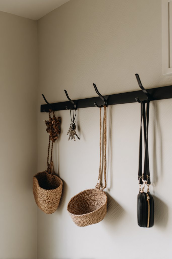 Imagine wall-mounted hooks holding your favorite accessories like scarves or bags, while woven baskets hang from ceiling hooks, storing items like chargers or snacks. The textured baskets add visual warmth and contrast against a clean wall. This setup makes everything easy to grab and puts clutter out of sight, creating a tidy, inviting environment.