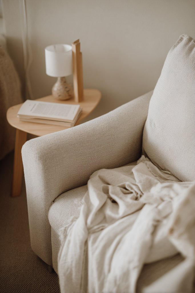 Picture a plush armchair with textured cushions and a soft throw, nestled beside a window or in a quiet corner. A small side table holds your favorite book or a cup of tea. Soft lighting, like a wall sconce or a small lamp, casts a warm glow, making it inviting. The space feels intimate and restful, perfect for unwinding.