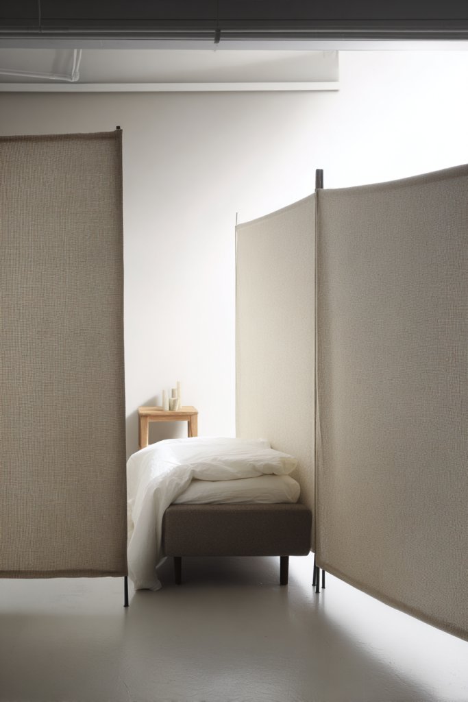 Visualize lightweight, foldable screens that can be moved or stacked according to your needs. They might feature woven textures, fabric panels, or sleek metal frames. When set up, they form a cozy boundary around your sleeping area or workspace. When not needed, they fold away, maintaining the room’s airy feel.