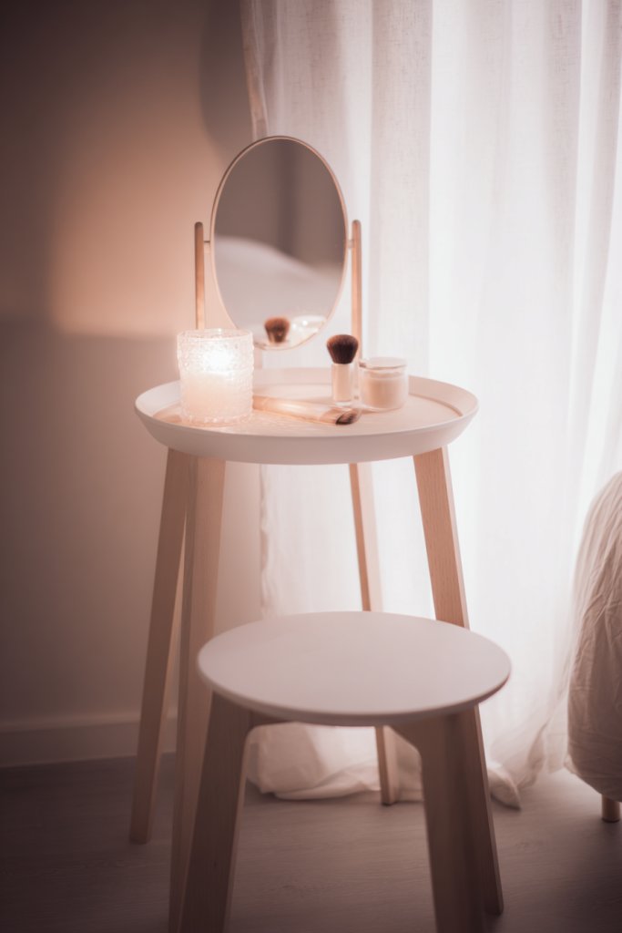Picture a compact table with a sleek surface, paired with a decorative mirror hung above. The space is accessorized with a few well-chosen containers for makeup, skincare, or jewelry. Soft lighting, such as a wall-mounted sconce or LED strip, creates an inviting glow. The setup transforms a corner into a personal retreat, blending functionality and style seamlessly.