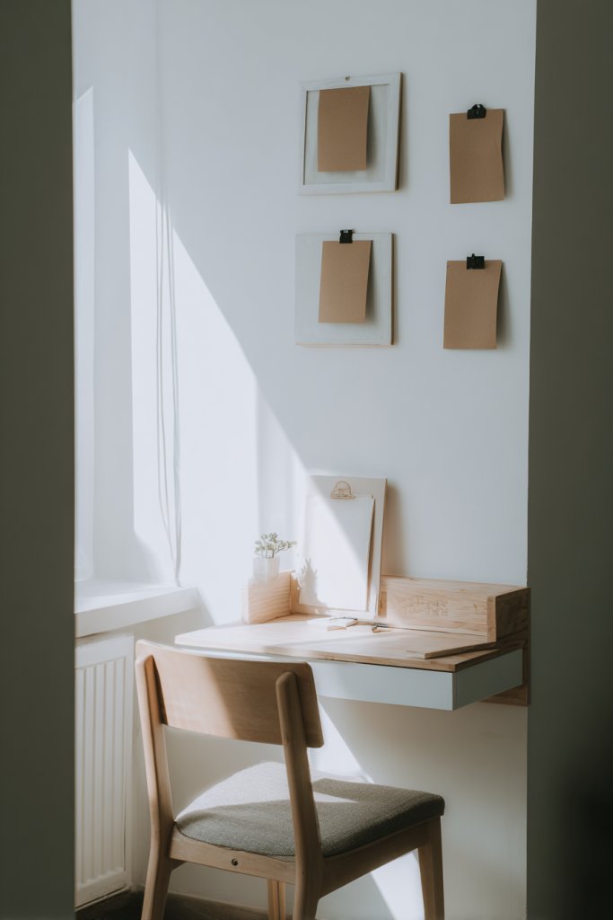 Choose a desk that fits your space—wall-mounted, fold-down, or small tabletop. Use stylish organizers, trays, or pencil cups that match your decor theme. Incorporate a corkboard or magnetic strip for notes and reminders. For a cozy touch, add a textured rug underneath or a fabric-covered pinboard. Adjust your setup seasonally or as your needs evolve.