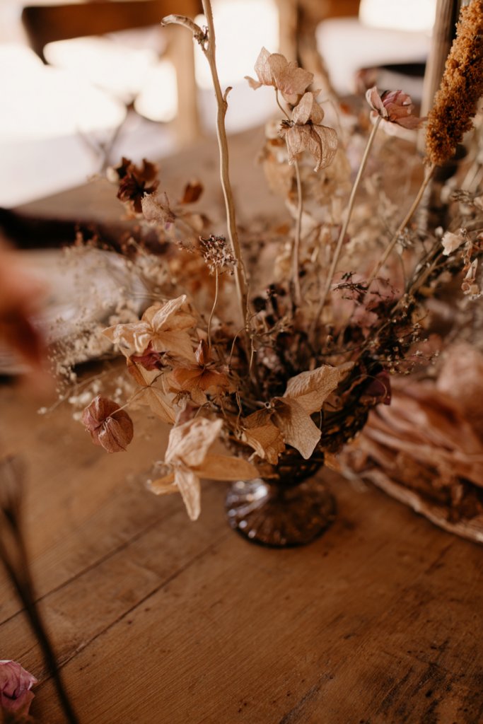 Picture a rustic wooden tray filled with an assortment of dried roses, lavender, and eucalyptus, tied with vintage ribbon. The muted colors and textured blooms evoke a sense of nostalgia. Arranged artfully in antique bowls or vintage bottles, they create an inviting, handcrafted centerpiece. The scent of dried florals adds sensory warmth.