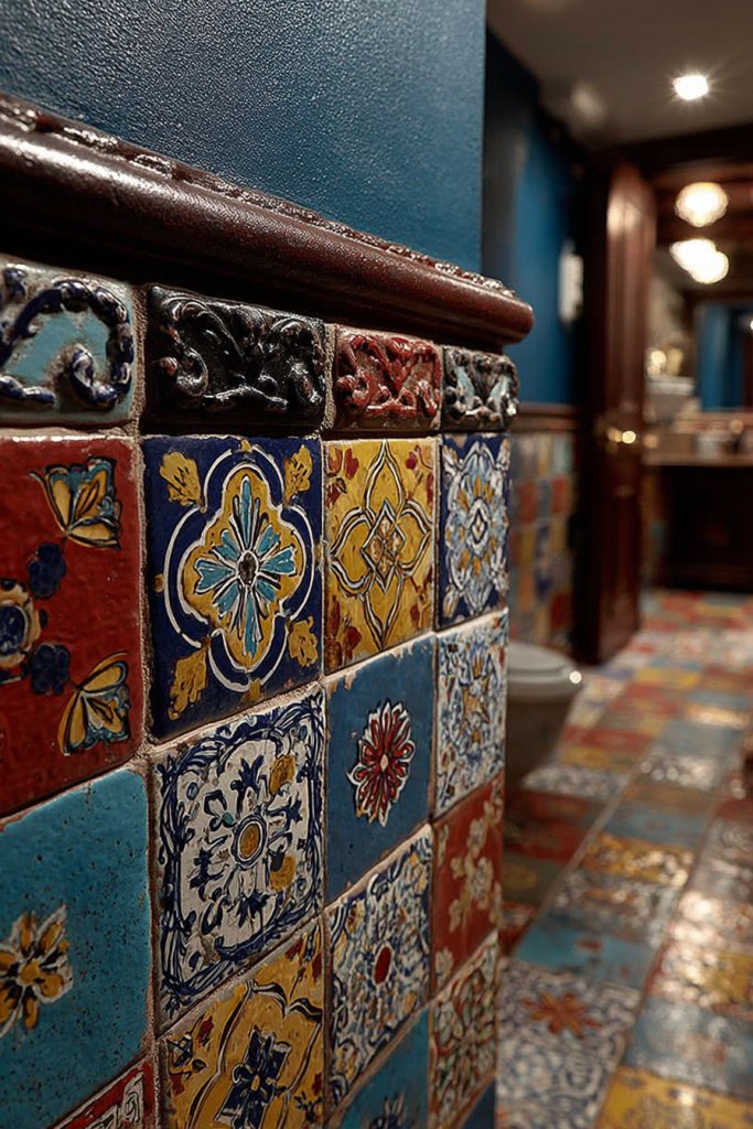 Picture a wall with intricate, repeating motifs in shades of cobalt blue, terracotta, and sunny yellow. The pattern resembles traditional ceramic tiles, giving your space a warm, inviting feel. The vivid colors and detailed designs evoke a sunny Mediterranean courtyard or seaside villa. It’s a lively, textured backdrop full of personality.