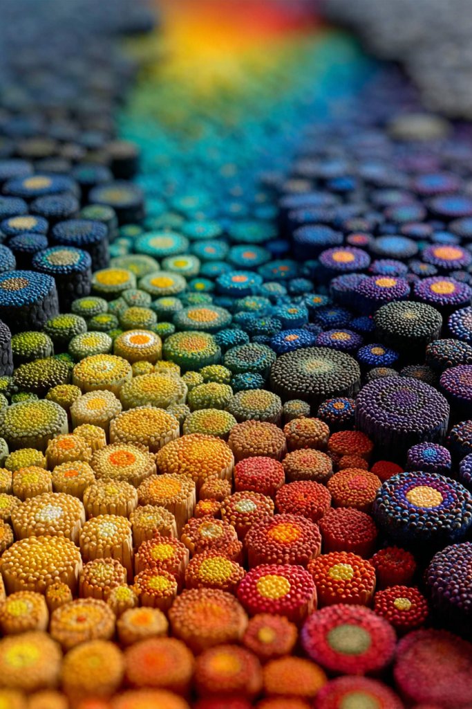 Imagine tiny dots in shades of blue, pink, yellow, and green gradually transitioning from one color to another, forming a seamless gradient. The pattern feels lively and tactile, with each dot contributing to the overall flow. The effect resembles a vibrant, painstakingly painted artwork that invites close inspection and admiration. It’s playful and artistic, perfect for creative spaces.