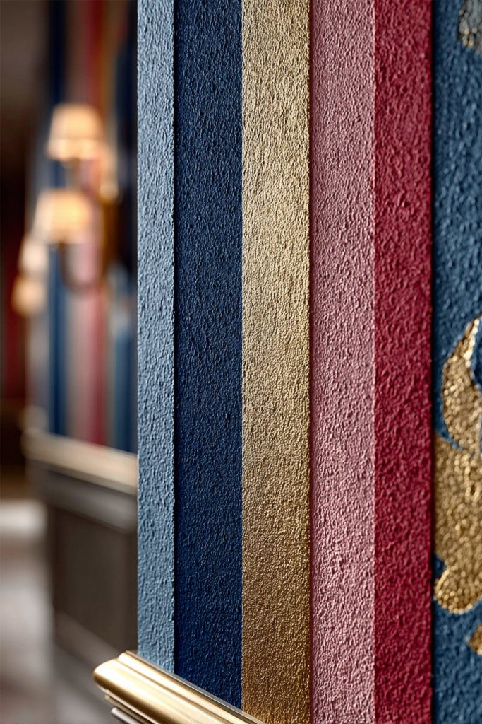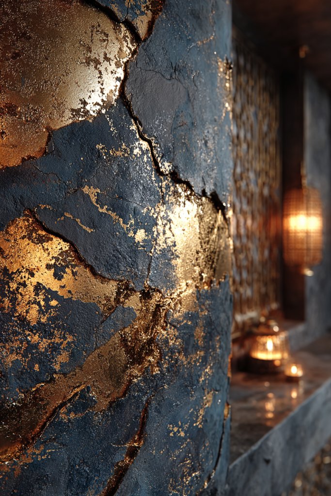 Picture a matte painted wall with delicate streaks of gold or silver leaf applied along the edges or in abstract patterns. The metallic shimmer catches the light at different angles, creating an ever-changing visual effect. It’s like having a piece of jewelry embedded in your wall—sophisticated, shiny, and understated. The subtle glow adds warmth and richness that instantly draws attention.