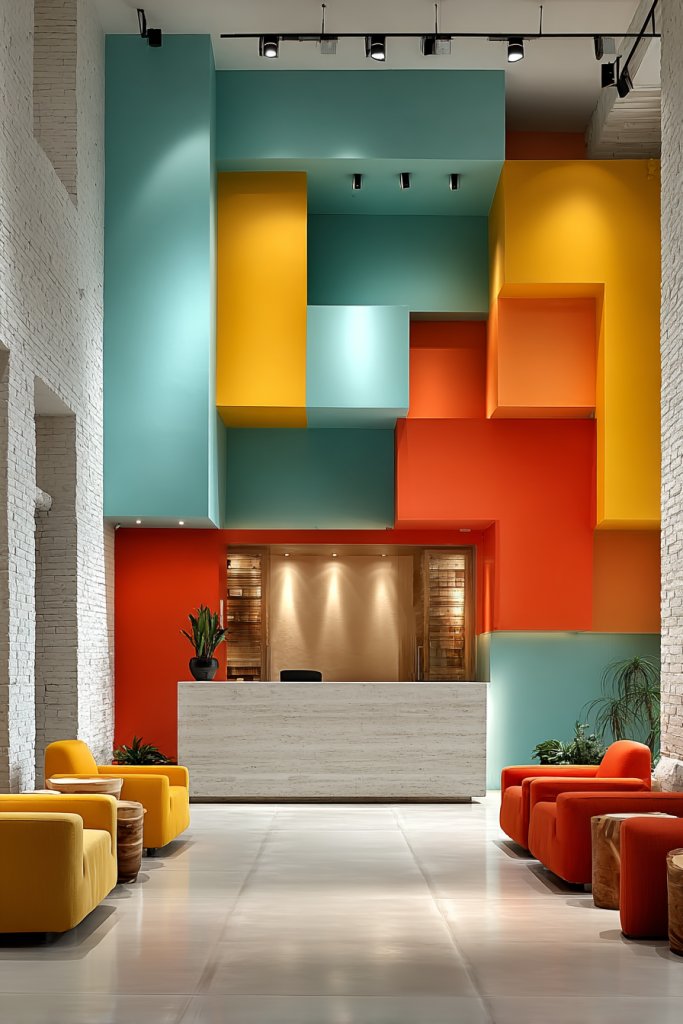 Imagine a wall divided into large, vibrant sections—like a giant canvas painted in bold shades of turquoise, coral, and lemon. Each block defines a different zone or simply adds visual interest to an otherwise plain wall. The clean lines and bright hues create a lively, youthful atmosphere that’s impossible to ignore. It’s like an art piece that doubles as wall decor.