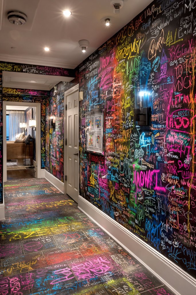 Envision a wall coated in vibrant neon chalkboard paint, glowing under blacklight or in daylight with a bright hue like pink, green, or blue. The surface invites spontaneous drawings, messages, or schedules, constantly changing and evolving. The neon effect energizes the room, making it an interactive centerpiece. Whether in a kitchen, playroom, or home office, it’s a dynamic way to express yourself.